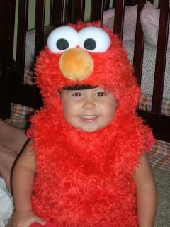 After high-tea, we read some Elmo books. Mommy let me wear the Elmo suit that I am borrowing from Tenney. I sure do love this Elmo suit...Since it was a special occasion, Mommy let me try it on!